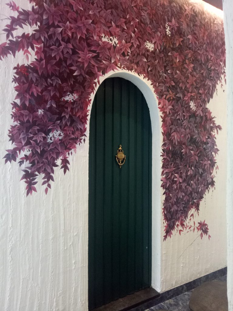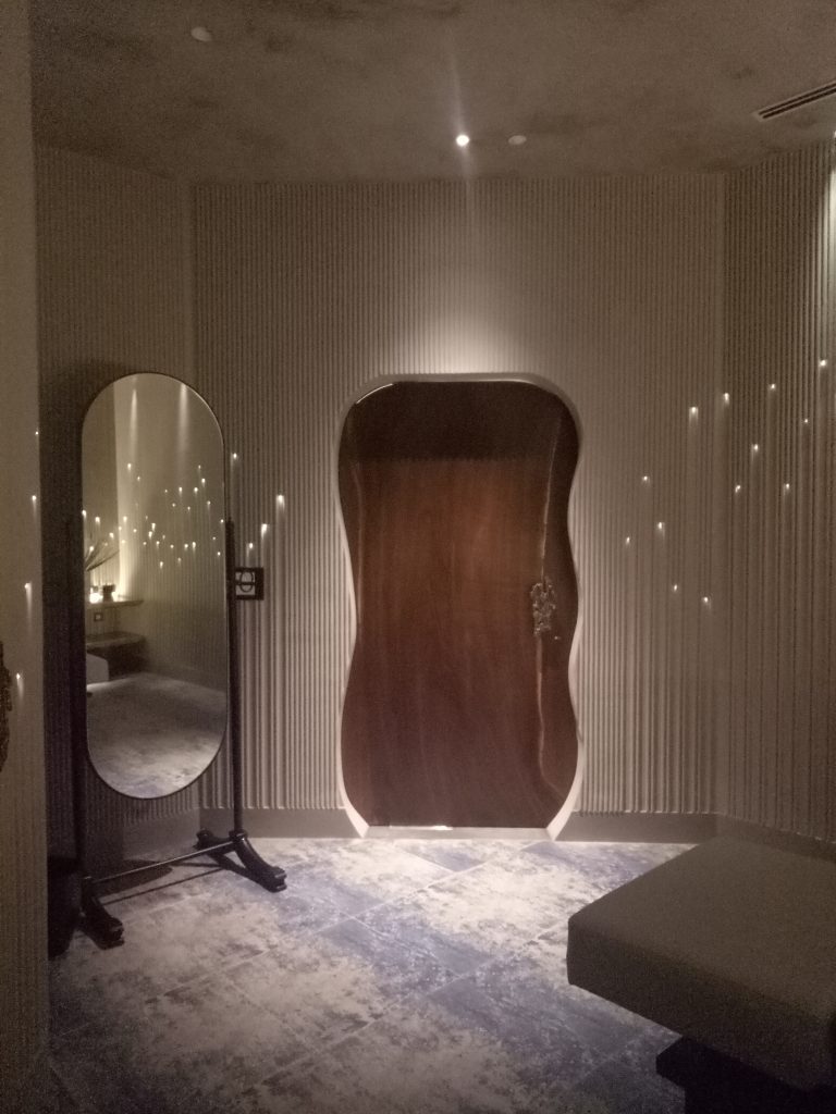 A beautiful bath area with a classy entrance